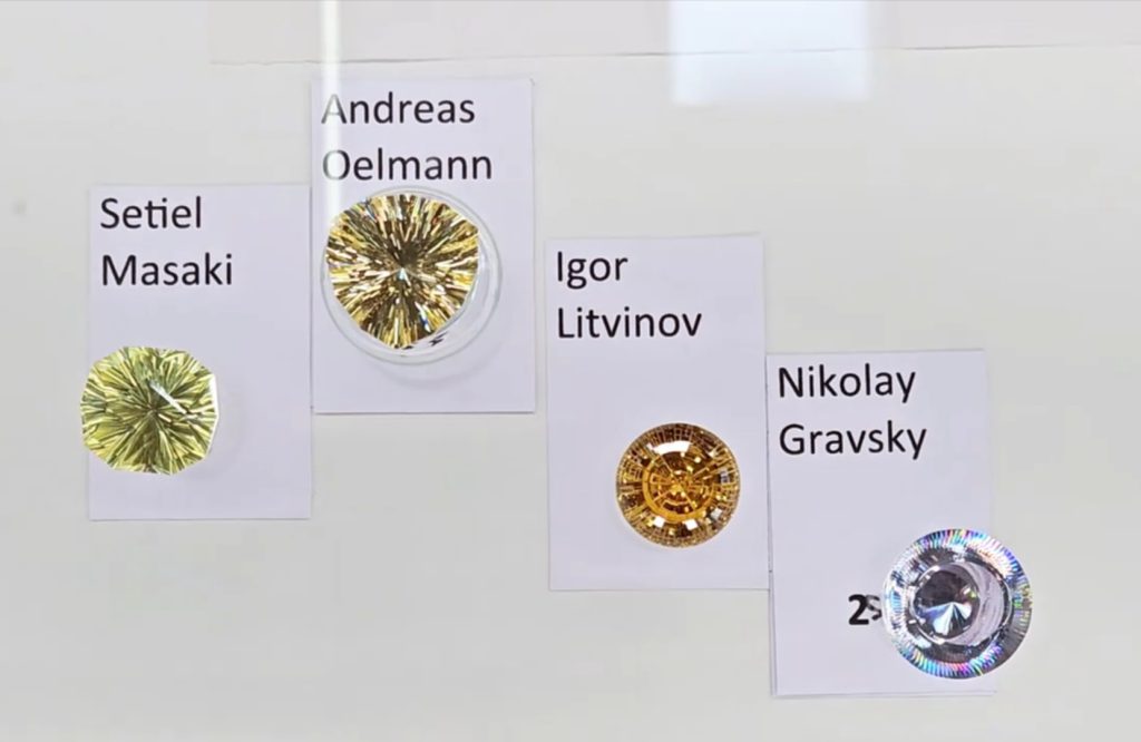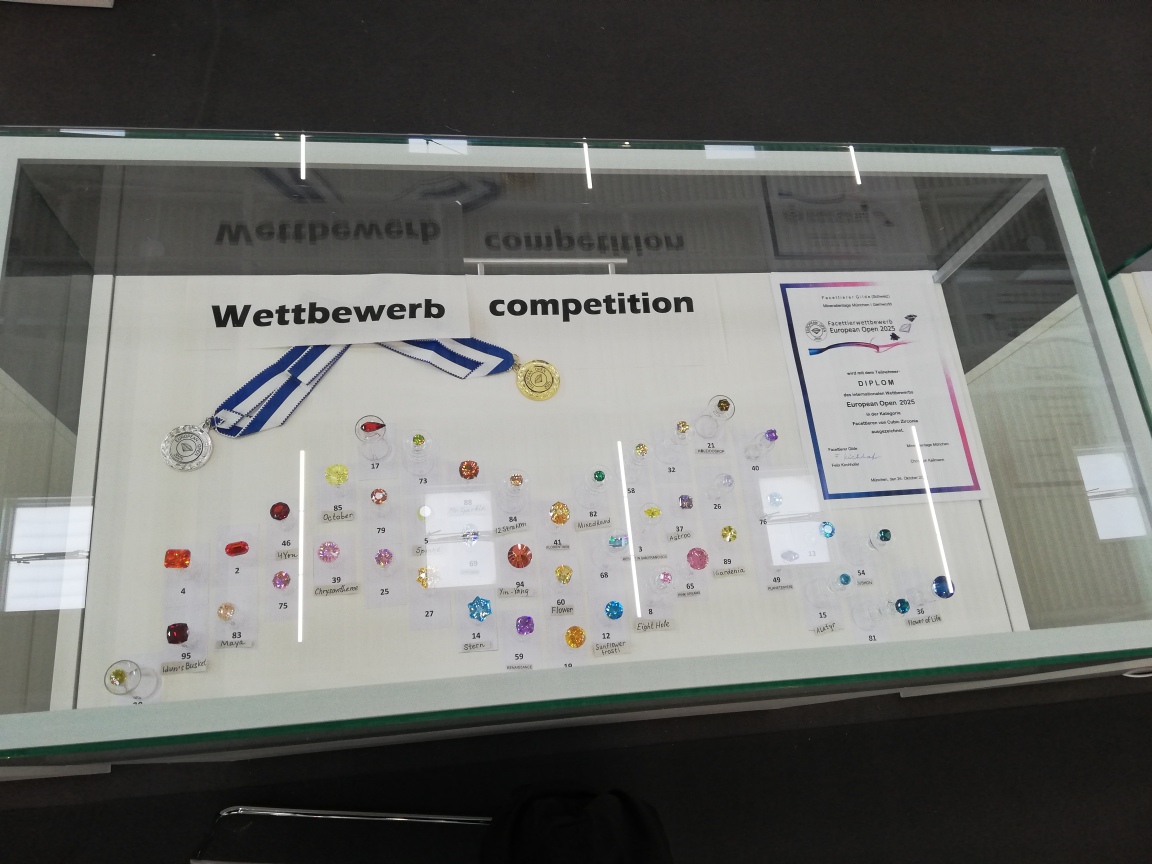 Martin Bänziger hat seine Siegersteine vom Australien Open 2024 und 2025 mitgebracht. Die vier Steine bekamen zweimal Gold und zweimal Silber und somit den Gesamtsieg. Wir gratulieren Martin zu dieser grossartigen Leistung. Er hat in diesem Jahr seinen vorjährigen Sieg wiederholt. Ueli Sandmeier wie auch im letzten Jahr hat eine Vitrine mit verschiedenen Steinen im Schliff Munichshow Star gefüllt.